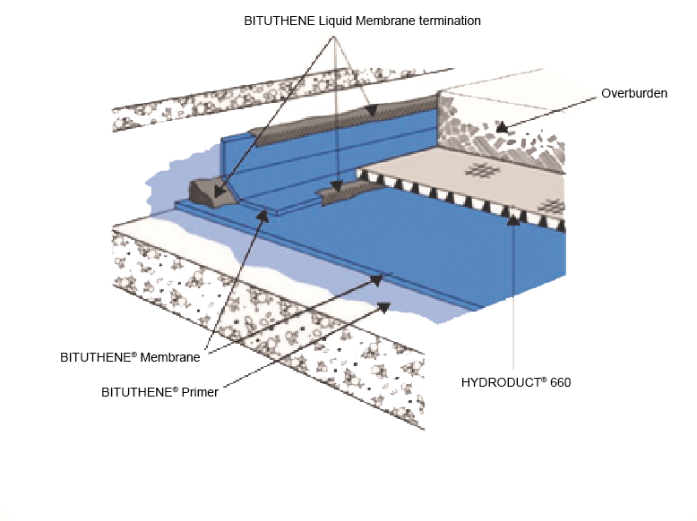 - Conduct the flood test 24-hours after completing the application of BITUTHENE waterproofing system. Immediately after flood test is completed, and all necessary repairs made, install drainage composite to protect the BITUTHENE membrane from traffic and other trades.
